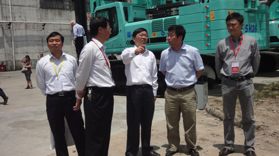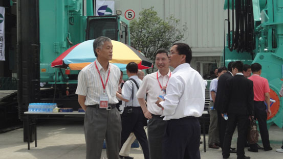 正在和用戶代表攀談的中國工程機械工業協會會長祁俊與書記馬衛東