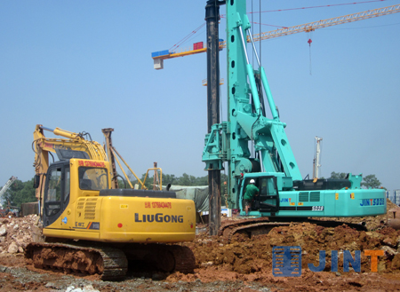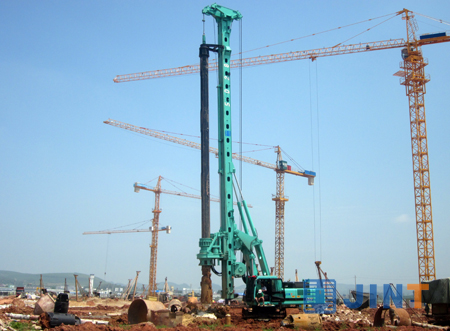 吳圩國際機場南寧市對外的形象窗口之一,承擔著極為重要的航空交通責任,是南寧市重大基礎設施項目之一。廣西壯族自治區、南寧市政府都該項目建設十分重視,專門成立了南寧機場擴建項目工程指揮部,全程跟蹤,協調、指導和監督,全力推進項目建設。在這一項目中,基礎工程是決定項目進度的關鍵要素,要在紅黏土、密實黏土、微風化白云質石灰巖的地層條件下進行最深達24m樁基施工,巖層最大硬度超過10Mpa。這對鉆進施工技術和旋挖鉆機性能都是嚴峻考驗。在上海金泰現場服務小組7×24全程保障下,SD28鉆機不負眾望,與同工地施工的柳工915D挖掘機一起,為保障這一重點工程按期完工在日夜運作,并交出了一份滿意的答卷,以單樁2-4小時的效率,遠超同工地其他品牌產品,贏得鉆機用戶、業主單位的好評,在紅土地上又一次創造了金泰綠的佳績。