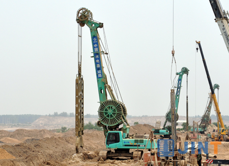 經過一年的奮戰,“引黃灌溉龍湖調蓄工程”(簡稱“龍湖工程”)已進入尾聲。據統計,截止2012年6月底,上海金泰工程機械有限公司共有32臺液壓連續墻抓斗參與“龍湖工程”施工,占到施工抓斗總數三分之二之多。在整個工程防滲墻項目中,幾乎每個標段段都有金泰機械的綠色“唱主角”。針對各標段地質和水文特點,金泰公司因地制宜將工法設計和施工機械完美結合,創新性的拓展了液壓抓斗的應用領域。其中一款重量17噸、架體加長1米的400mm薄壁專用斗架體總成,有效解決了施工中常規抓斗無法解決的施工難題,得到了施工單位和甲方的一致認可。