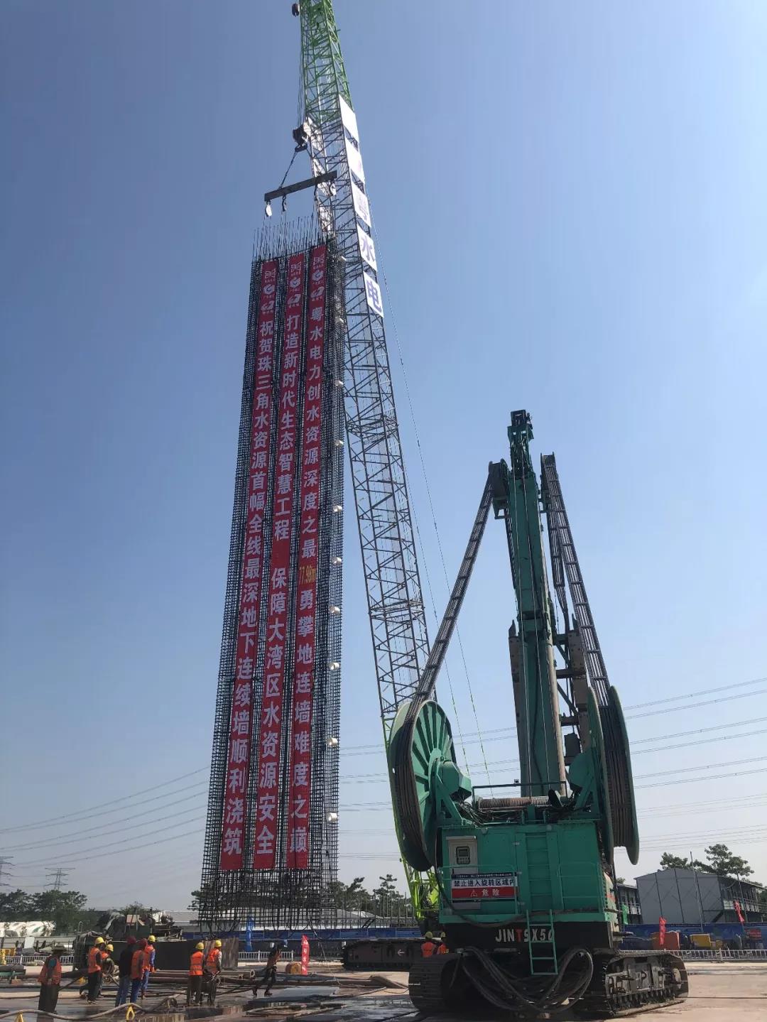 特別在2019年11月8日,這是國產雙輪銑在發展史上值得記上一筆的一天,現場經過項目管理人員、設備機手連續多天的鋼筋籠加工和成槽施工,現場成功下入首幅長度為77.98m的鋼筋籠,并在晚11點完成澆筑。此次地連墻鋼筋籠成功的吊裝、澆筑對金泰來說意義深遠,在全力保障大灣區水資源安全建設的同時,更成就了金泰雙輪銑在國產雙輪成槽深度的里程碑時刻。