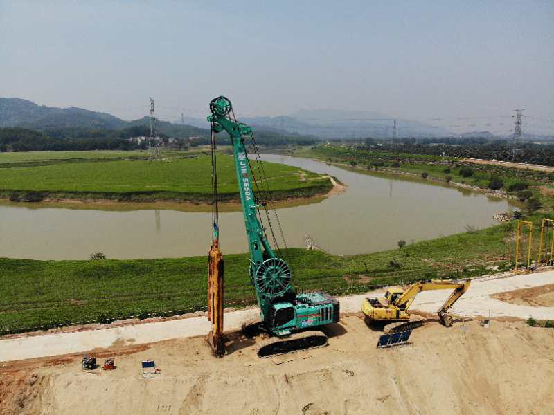 該工程(一標段)由廣東水電二局股份有限公司承建,廣州峻業基礎工程有限公司負責本標段防滲墻施工,選用金泰SG50A和SG46A液壓連續墻抓斗完成施工,工程總量約20137.2立方,防滲墻5204m,預計2020年9月上旬完成施工。主要任務是防御潖江洪水,在潖江蓄洪區啟用時圍內蓄滯洪水。主要施工內容:提升培厚、混凝提防滲墻、提頂道路、護坡、新建大廠北水閘、新建大廠南電排站、新建林塘圍水閘,新建林塘圍電排站。