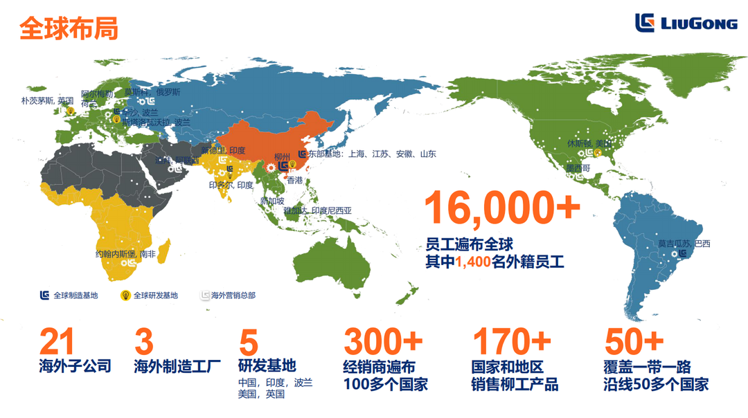 柳工在國際化領域處在行業的領先地位,全球擁有16000多名員工,300多家經銷商、30家海外子公司和機構、5個全球研發基地,產品遠銷170多個國家和地區,國際業務覆蓋“一帶一路”沿線85%的國家。近年來,柳工海外市場保持高速增長態勢。新冠疫情期間,柳工海外業務仍逆勢上揚。2021年,柳工海外收入同比大幅增長。今年1月份,銷量同比翻翻,實現高質量“開門紅”。