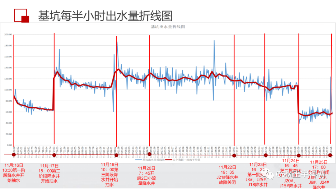 (1)基坑面積約25000㎡,通過降水井的開啟,可將坑內水位穩定在絕對標高:0.5~1.9m,坑內總抽水量241.9m³/h,相當于4口60立方米的水泵出水量;